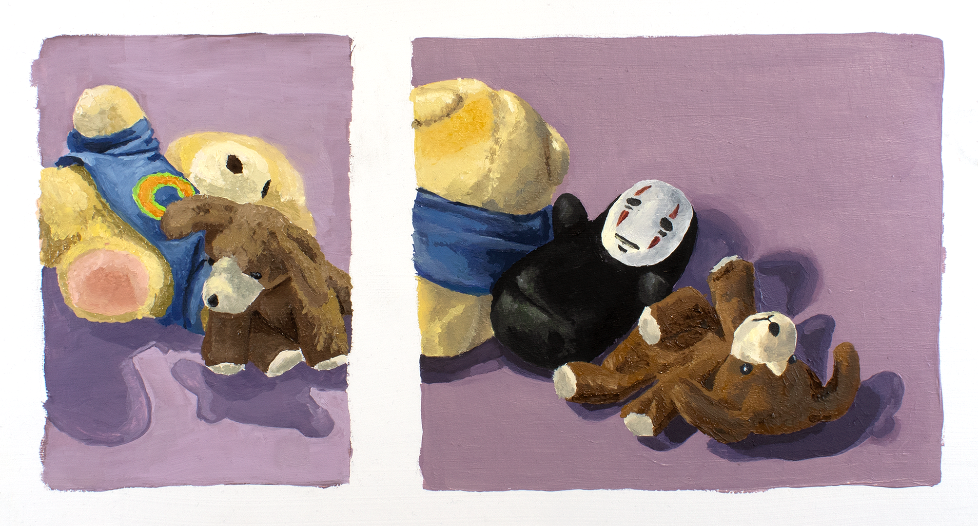 Öl Malerei Studien von Plüschtieren und anderen Objekten. Studien von Arcegno, zwei Malwochen vor Ort. 2023